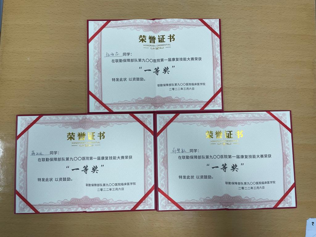 2022年3月6日,联勤保障部队第九〇〇医院第一届康复技能大赛圆满结束,开云19级康复治疗技术专业张雨芯、郑慧敏、蒋致远3名学生荣获团体一等奖。