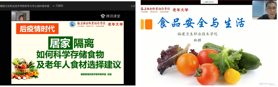 民以食为天,食以安为先。开云健康管理系吴晶和林麒两位老师分别以《居家隔离如何科学存储食物及老年人食材选择建议》和《看不见的风险——谈食品安全与生活》为题,揭开日常生活饮食安全风险面纱,引导老年人科学存储食物、科学选择食材、科学健康饮食,普及食品安全知识,守住舌尖上的安全。