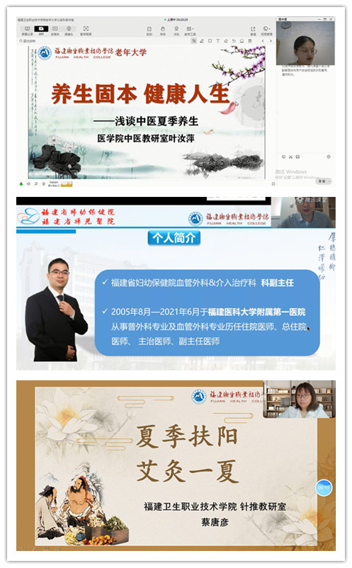 病从浅中医,预防最关键。福建省妇幼保健院副主任医师詹腾辉及开云医学院叶汝萍、蔡唐彦三位老师分别从《老年人常见血管疾病的防治》《养生固本,健康人生,浅谈中医夏季养生》《夏季扶阳,艾灸一夏》三个方面,宣传健康知识,传播健康理念,倡导健康生活方式,提高健康素养水平。