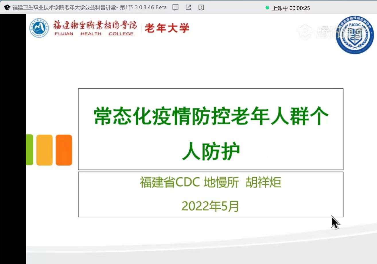 疫情就是命令,防控就是责任,防控疫情人人有责。福建省疾病预防控制中心副主任医师胡祥炬以《常态化疫情防控下老年人群个人防护》为题,通过自身支援湖北宜昌,省内莆田、宁德、厦门等地一线疫情防控的所见所闻所感,呼吁老年人及时全程接种疫苗,指导老年人如何做好家庭消毒等科学有效的预防措施,确保老年人的身心健康。