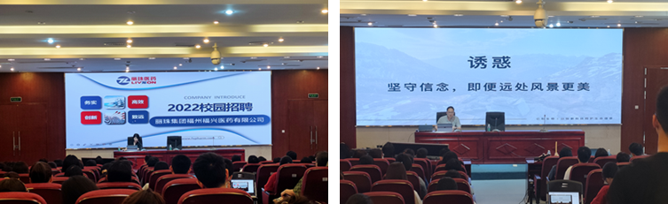会上,企业负责人向同学们介绍了公司概况、岗位职责、薪资待遇和发展规划,阐述了公司的运营模式、运营范围及人才需求,传达了企业的文化价值观、人力资源政策、招聘程序和职位等信息,并现场回答同学们的问题,让学生对企业有更立体、直观的了解。企业负责人鼓励毕业生入职后,从基层岗位做起,利用自身在学校所学的专业知识,投入到服务广大人民身心健康的医药卫生事业中,实现个人发展进步的同时,也为企业创造价值,为健康中国、健康福建贡献青春磅礴力量。