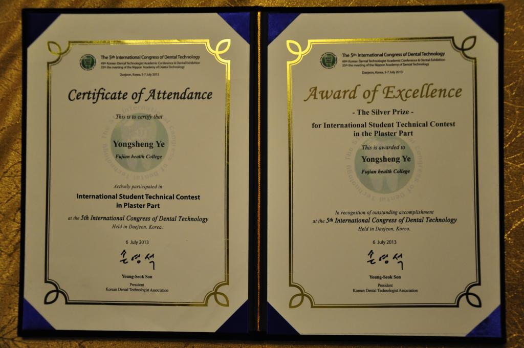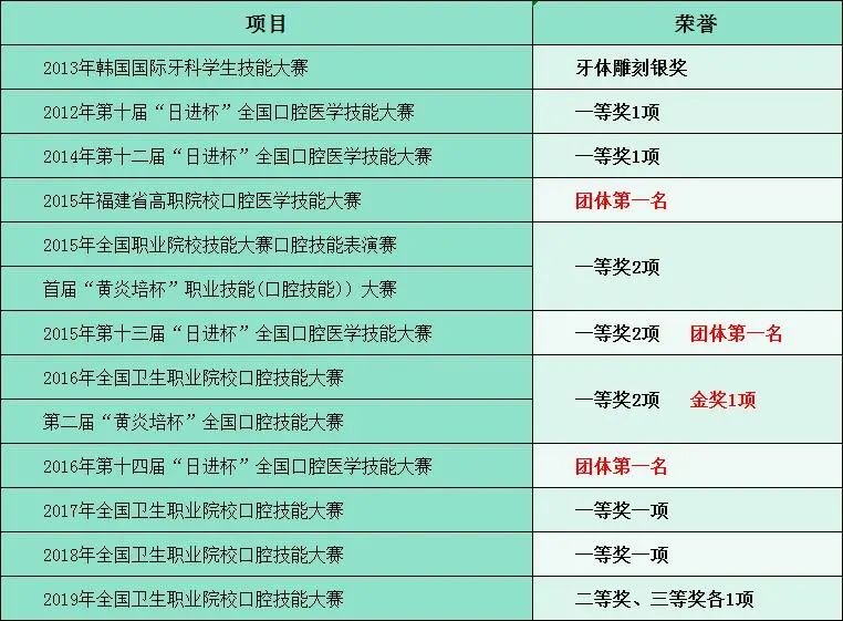 近年来,学生在各级别口腔医学技能大赛上共获37个奖项,包括国际银奖1项、全国金奖1项、全国一等奖10项、2次全国团体第一名、1次省级团体第一名。学生获第五届国际口腔技师学术大会(韩国)口腔医学技术专业石膏牙雕刻银奖(第二名),是第一个在该项国际比赛中获奖的中国学生,实现了中国零的突破。