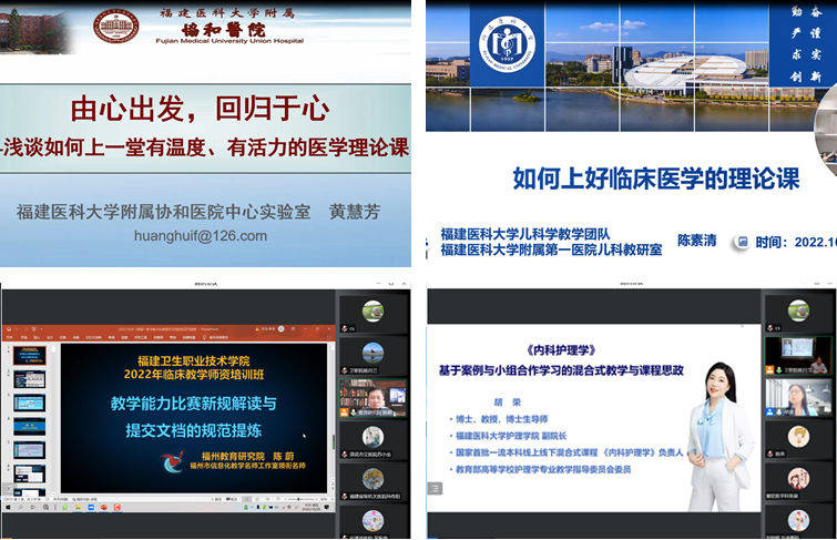 本次培训班邀请了福建医科大学附属协和医院黄慧芳、福建医科大学附属第一医院陈素清、福州教育研究院陈蔚、福建医科大学胡荣4位教学经验丰富、专业水平过硬的专家做专题讲座,授课主题分别为《由心出发,回归于心-浅谈如何上一堂有温度有活力的医学理论课》《如何设计临床医学的理论课》《教学能力比赛新规解读与提交文档的规范提炼》《基于案例与小组合作学习的线上线下混合式教学》。授课内容既有教学设计的诀窍,也有课程实施的技巧,既有混合式教学的案例解析,也有温度活力兼备的医学伦理授课经验分享,培训内容丰富且接地气。