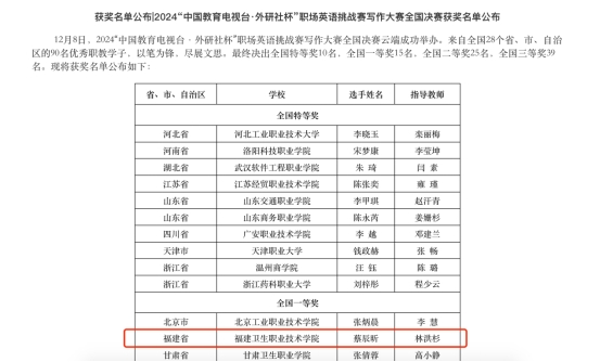 近日,2024“中国教育电视台·外研社杯”职场英语挑战赛写作大赛国赛正式落幕,开云医学院蔡辰昕同学从全国28个省、市、自治区的众多优秀选手中脱颖而出,荣获英语写作大赛全国决赛一等奖。
