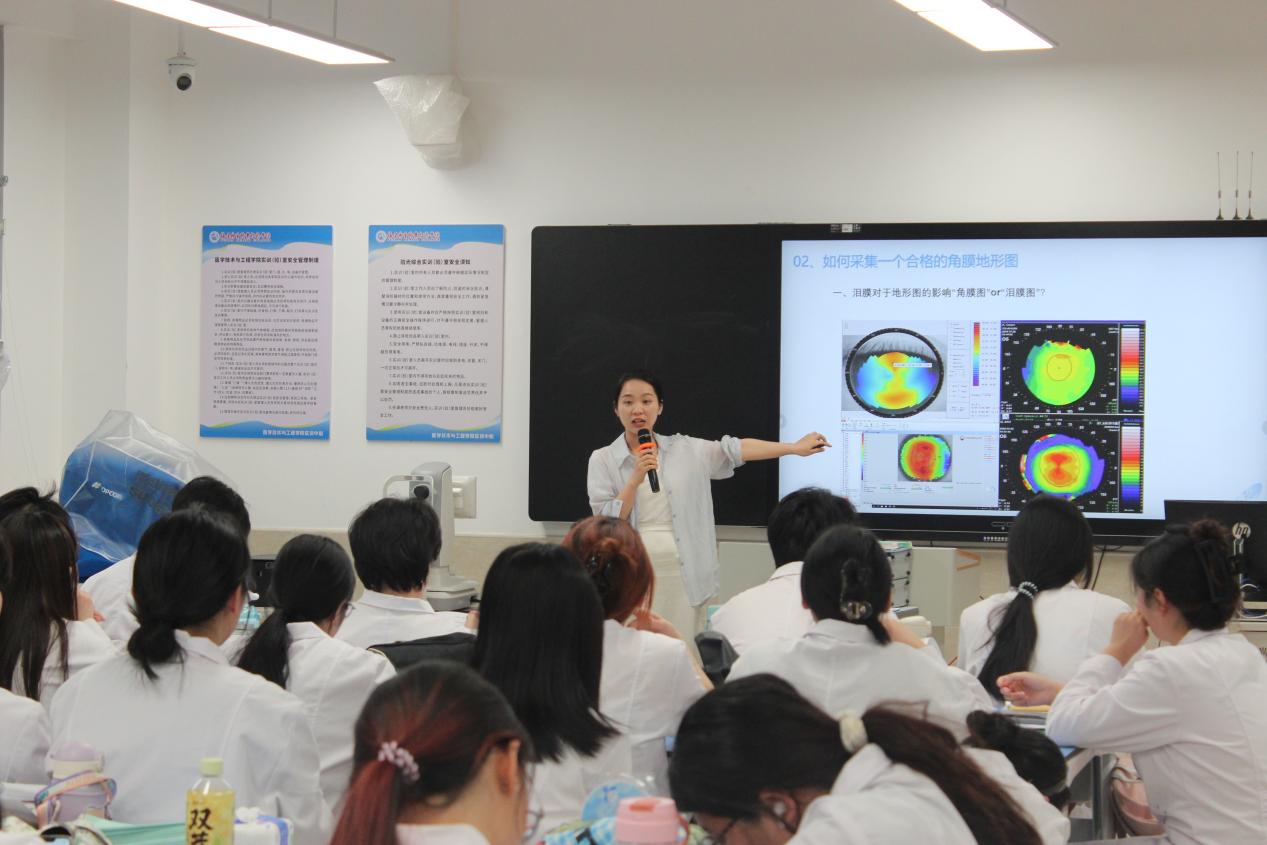 普诺瞳公司的专业讲师以其丰富的行业经验与扎实的专业素养,为同学们深入浅出地讲解角膜塑形镜的种类、材质、设计原理以及适配要点等理论知识。课堂上,同学们全神贯注、踊跃提问,积极与讲师互动,现场气氛热烈。这些理论知识为同学们后续的实践操作以及未来的职业发展筑牢根基,也让学生对眼视光行业的前沿技术与规范流程有了更加清晰的认知。