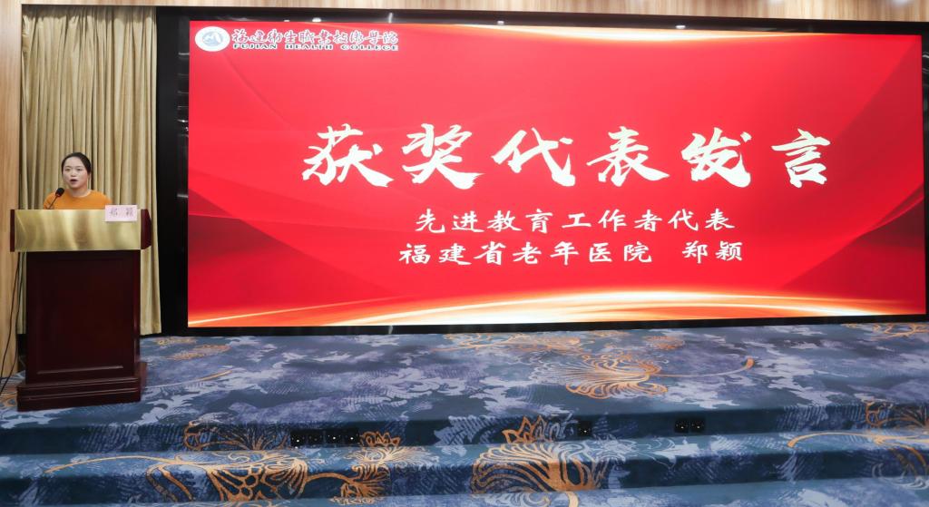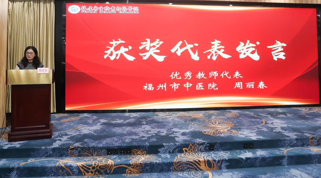 福建省老年医院郑颖主任、福州市中医院周丽春主任作为受表彰代表先后发言。郑颖分享了长期扎根临床教学一线的实践经验,其“理论+案例”的生动教学方法引发共鸣;周丽春则围绕“临床与教学深度融合”展开阐述,彰显了新时代临床教师的育人初心与医者担当。