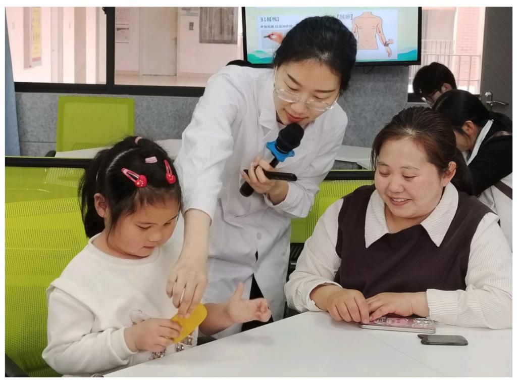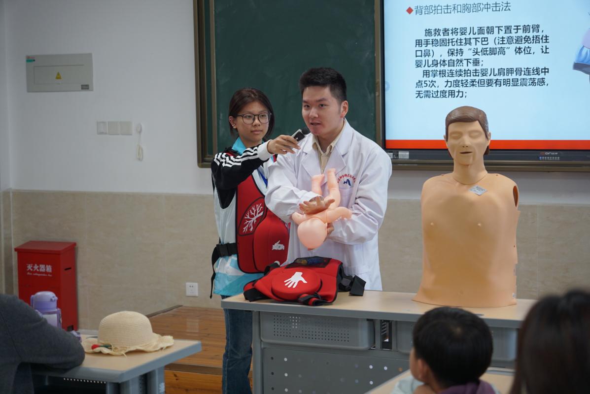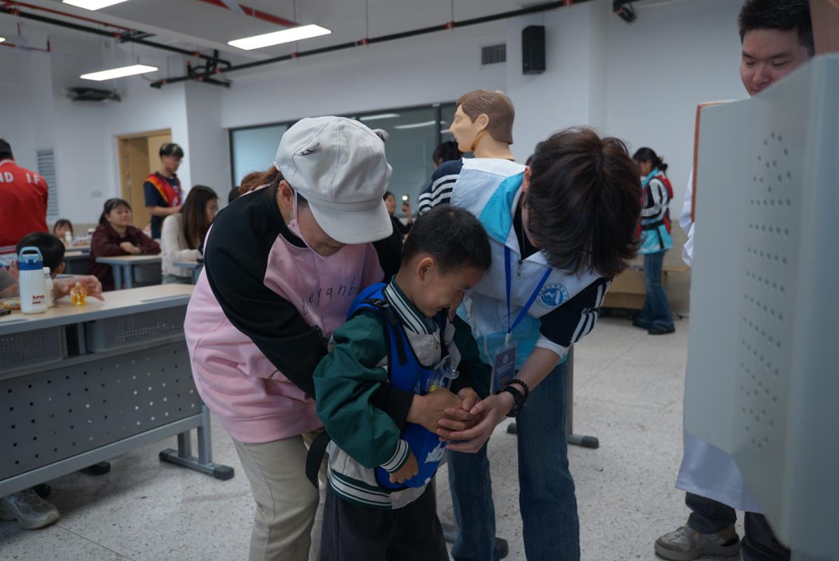 “剪刀、石头、布!”海姆立克急救法课堂上,王蔚老师的趣味口诀让急救知识不再枯燥。他现场演示婴幼儿及成人海姆立克急救操作,重点拆解拍背定位、手法技巧等关键知识点,家长和孩子穿上模拟马甲亲手实操,志愿者一对一耐心指导,手把手纠正动作,有效提升了家庭应对气道异物突发情况的应急能力。同时,志愿者还结合趣味讲解,普及肺结核防治知识,让健康防护理念深入人心。