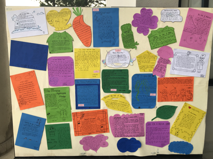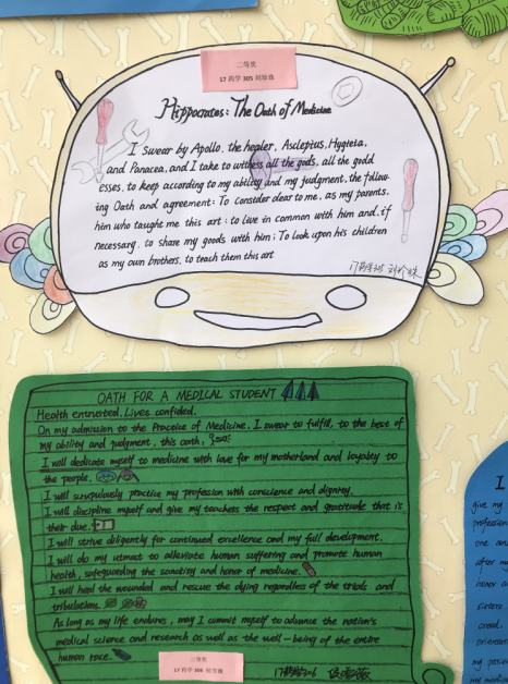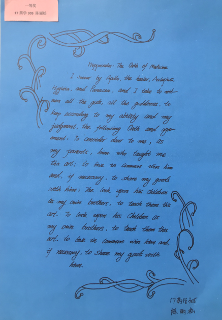 学生们的作品文案设计精美、主题紧扣专业,通过书写“希波克拉底誓言”“南丁格尔誓言”“医学生誓言”等名篇,在提高英文书写能力的同时,也陶冶了职业情操。