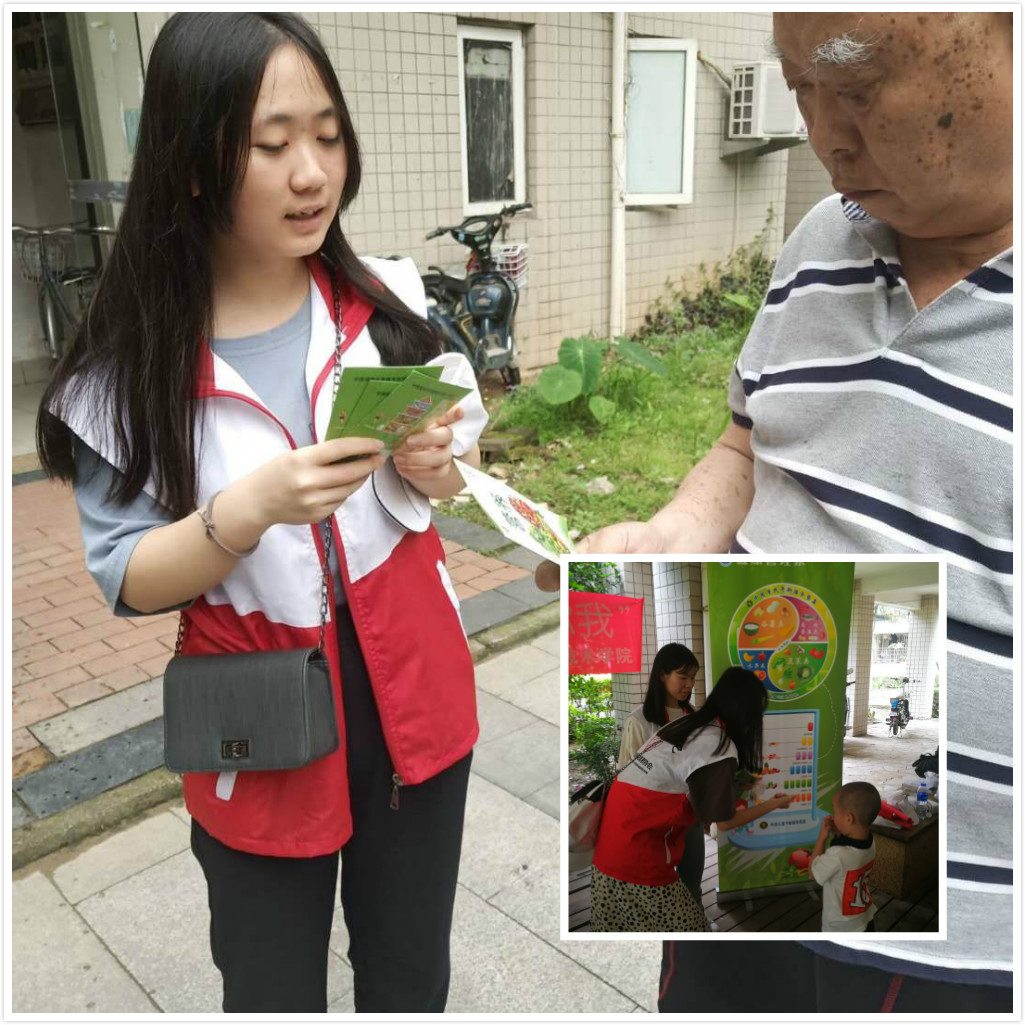 本次活动,主要分为营养调查、义诊及有奖互动环节。活动开始前,老师与志愿者们通过横幅宣传、悬挂各类营养知识海报的形式向社区居民展示膳食宝塔、膳食指南等日常膳食营养知识。