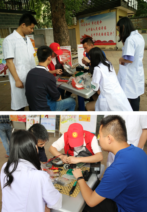 针对洪山桥社区里有较多的居民有维修旧电器的需求,医疗设备应用技术专业师生开展了此次维修活动,一方面,满足了居民维修的需求,使得损坏的电器得以重新使用;另一方面,为同学们提供了一个实践锻炼、服务社会的机会。活动中,同学们细心询问居民所需要维修电器的具体情况并留下联系方式方便通知居民取回,认真地维修每一件电器,相互交流学习。活动过程中,有些居民带来的电子血压计接地线损坏,如再继续使用,会有较大的安全隐患,同学们都认真地向居民一一仔细讲解,提醒其不要再次使用此电器。