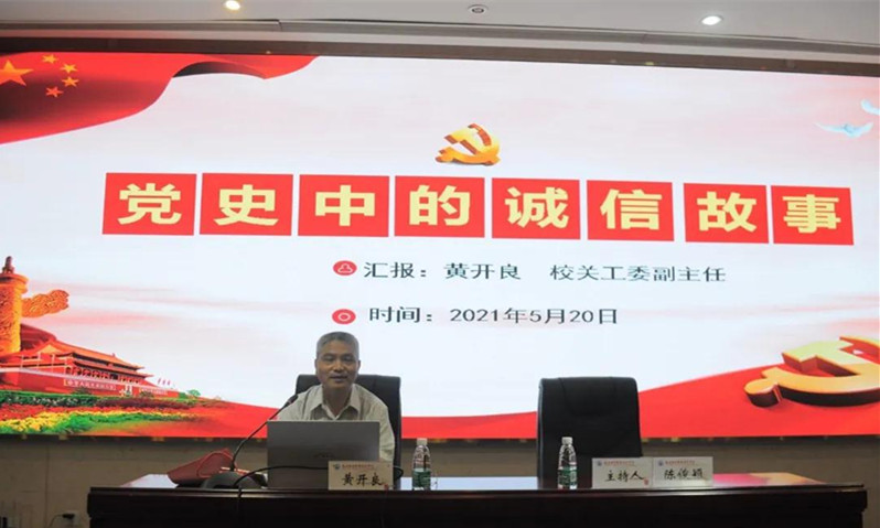 黄开良围绕开展党史学习教育的重大意义,通过“诚信为公的红色金融家--高捷成”、“写在墙上的留款信”等党史中的诚信故事,将学习党史和诚信教育融汇贯通、有机结合,讲述了党的百年奋斗史,彰显中国共产党以诚信赢得人民信任、取得人民支持,引导学生用党的奋斗历程和伟大成就鼓舞斗志、明确目标,树立和践行社会主义核心价值观。