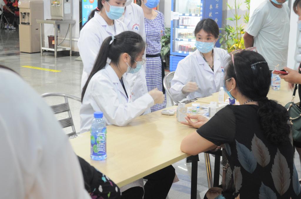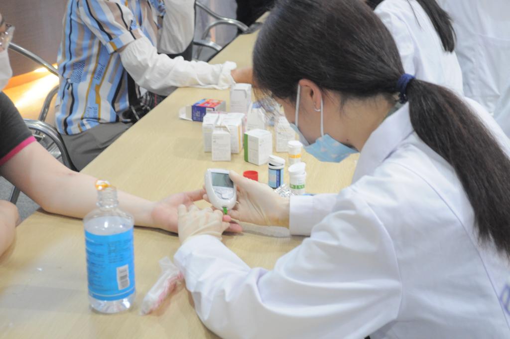 防控糖尿病,科学控糖。医学检验技术专业师生由党员教师卢虹带队,开展血糖和尿酸检测服务。师生们还结合检测结果,为群众科普糖尿病知识,并热心引导群众关注血糖健康,宣传科学控糖的有效措施。