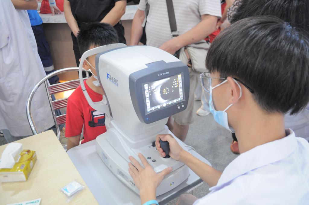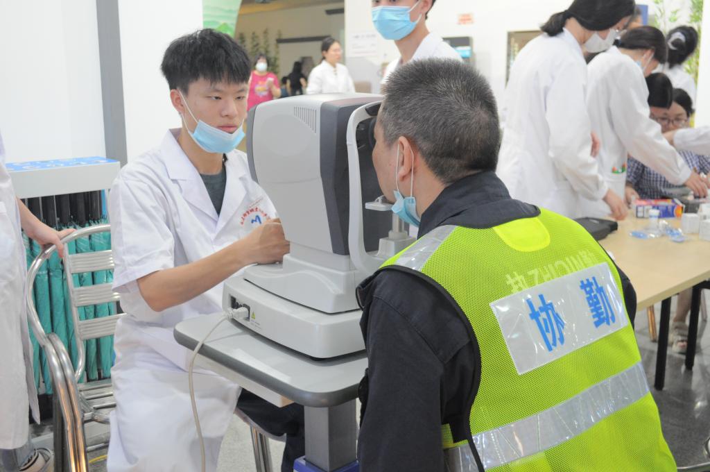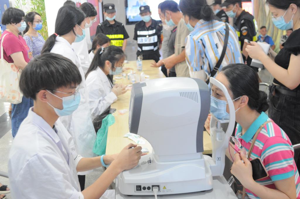 宣传科学用眼,共享“睛”彩。眼视光技术专业师生由党员教师张敏华带队,在义诊现场用专业仪器为群众开展验光检查。师生们为群众细心解读验光检测结果,耐心讲解爱眼护眼的方法,引导特殊情况及时就医。