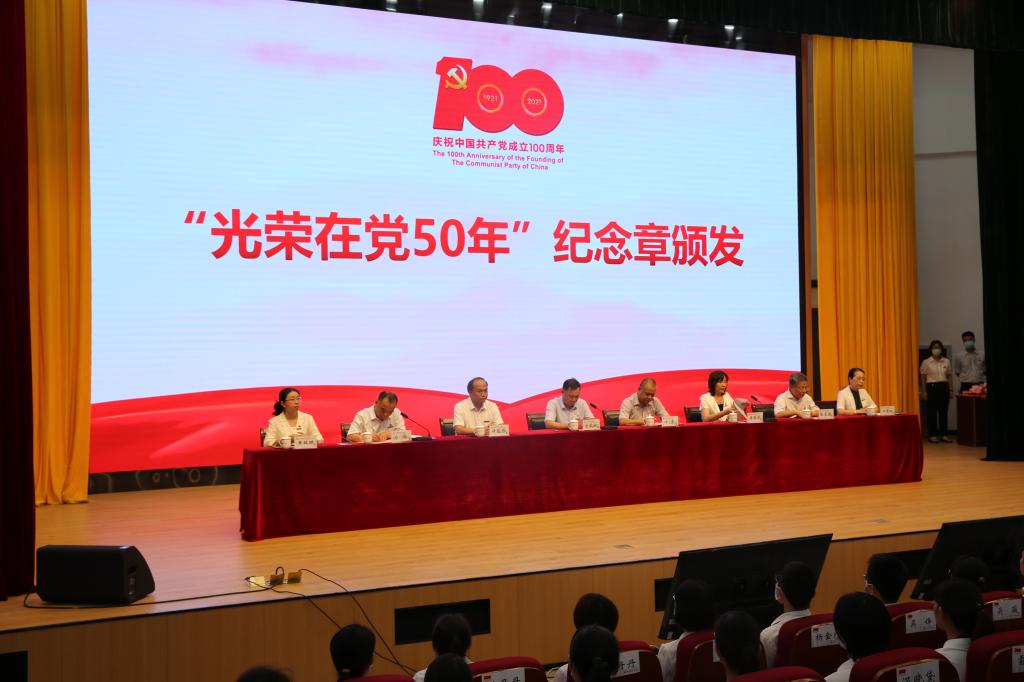 下午,巡回指导组一行列席参加了学校庆祝中国共产党成立100周年暨“两优一先”表彰大会,现场观摩学校颁发“光荣在党50年”纪念章、执教丹心传承仪式、“两优一先”表彰、新入党教师党员、学生党员代表入党宣誓、党委书记开设专题党课、师生唱红歌等活动。