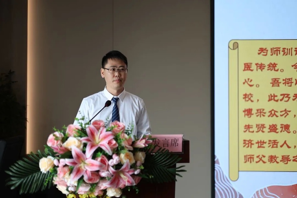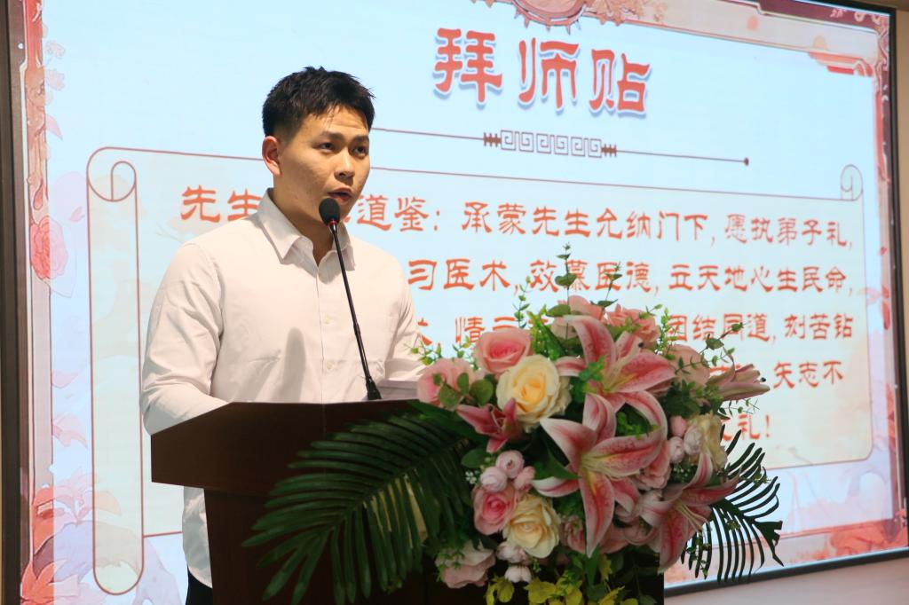 师承教育是中医药人才培养的主要模式,在传承中医药学术思想、临床经验方面发挥着不可替代的重要作用,而拜师是对中华医学的继承。学生们依次向自己的导师鞠躬行礼、呈拜师帖、奉茶、献花。