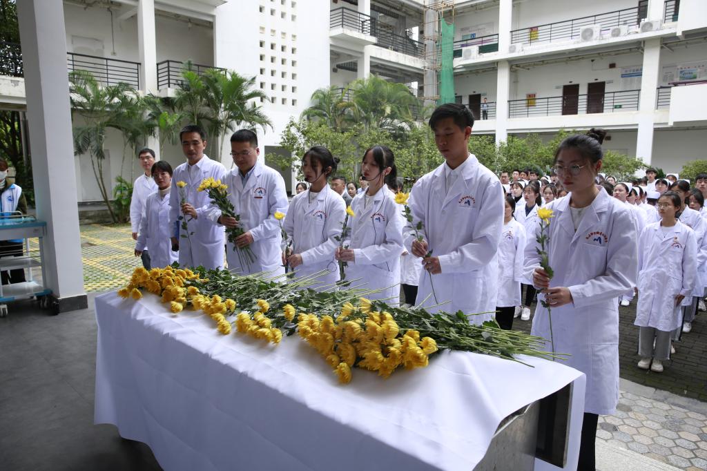 参加活动的支部党员与志愿者精心策划、各展所长。活动伊始,医学系第四党支部书记邓元荣开讲微党课。随后,党员教师袁婕带领全体参加人员进行解剖学誓词宣誓。其他党员教师带领全体领导、师生向大体老师鞠躬并敬献鲜花,郑重留言签名表明心志,表达心中的感动和对这些默默奉献者的追思与感念。
