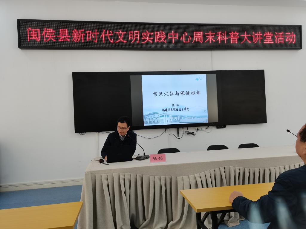 为进一步落实“我为群众办实事”,充分发挥党员的先锋模范作用,推广中医传统文化,2021年11月20日上午,医学系第三党支部党员教师陈铭、叶汝萍、蔡唐彦及学生们赴闽侯县新时代文明实践中心开展科普讲座及义诊活动。