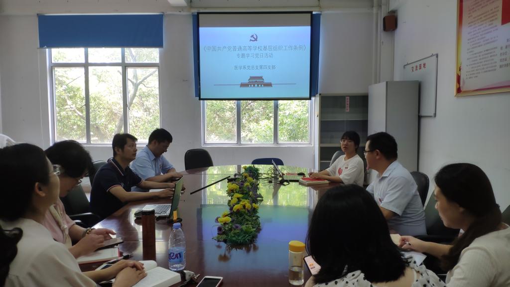 为全面规范党史学习教育,2021年6月17日,医学系第四党支部组织开展《中国共产党普通高等学校基层组织工作条例》(以下简称《条例》)专题学习活动,并由支部副书记修丽莉同志领学。