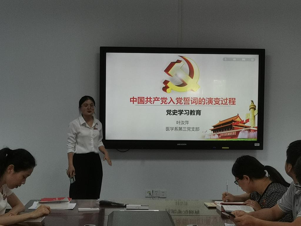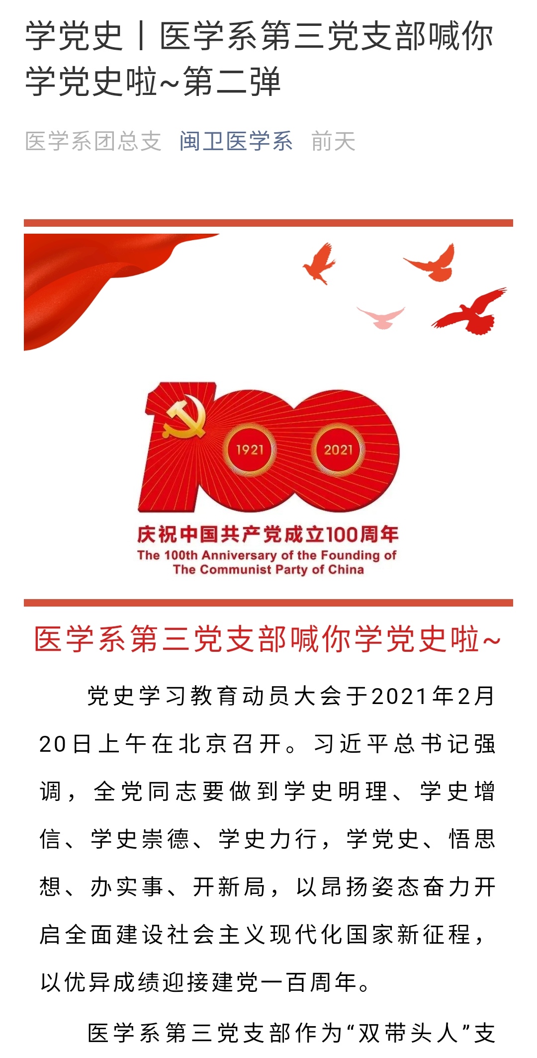 为深入开展党史学习教育,进一步增强支部党员的理想信念和责任感,近期医学系第三党支部积极陆续开展党史学习教育系列活动,以实际行动迎接中国共产党成立100周年。