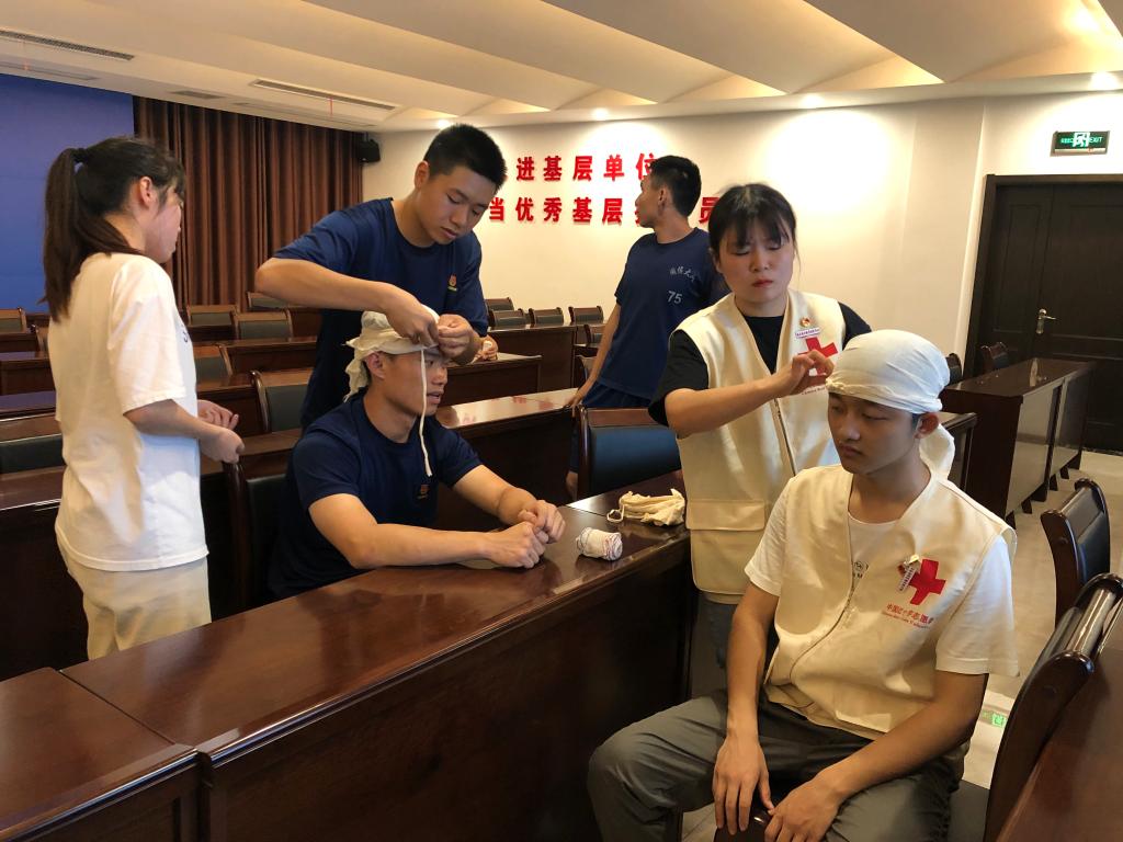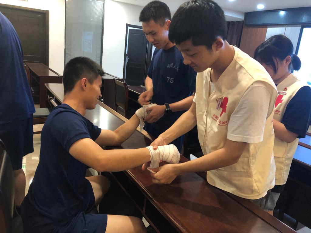 活动开始,由医学系红十字会负责人王婷同学为消防员们详细讲解绷带三角巾包扎法的理论知识,其余同学依次演示急救中常用的头部、胸部、手部、膝盖等部位的三角巾包扎手法。随后,消防员们两人一组在同学们的指导下进行包扎实践训练。最后,师生现场为消防员们提供刮痧拔罐义诊活动。