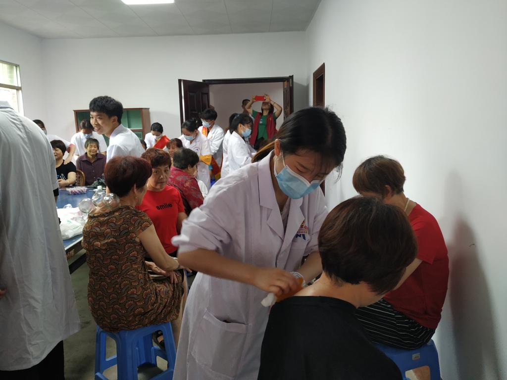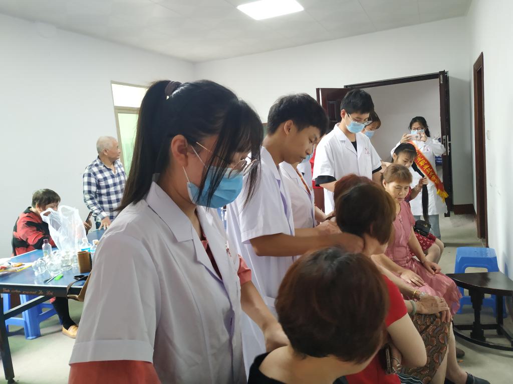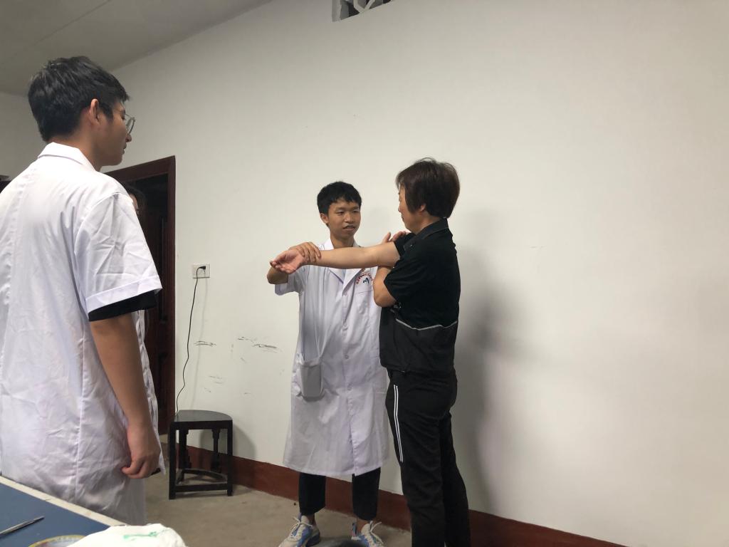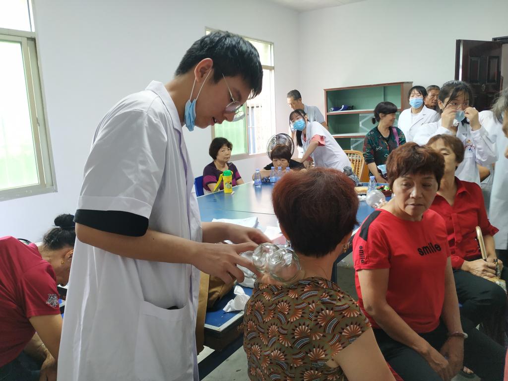 活动中,康健俱乐部社员为徐家村中老年村民送上了中西医康复等一系列义诊服务,项目包含颈肩部保健按摩、拔罐疗法、刮痧疗法、肩周炎功能锻炼指导及其他常见疾病康复宣教等。前来咨询、接受诊治的村民络绎不绝,针对他们的健康问题,康健俱乐部师生细致询问病情、耐心解释病情及发展、提出正确合理的健康指导并做相应的简单治疗,切实做到把健康送进社区、服务群众。