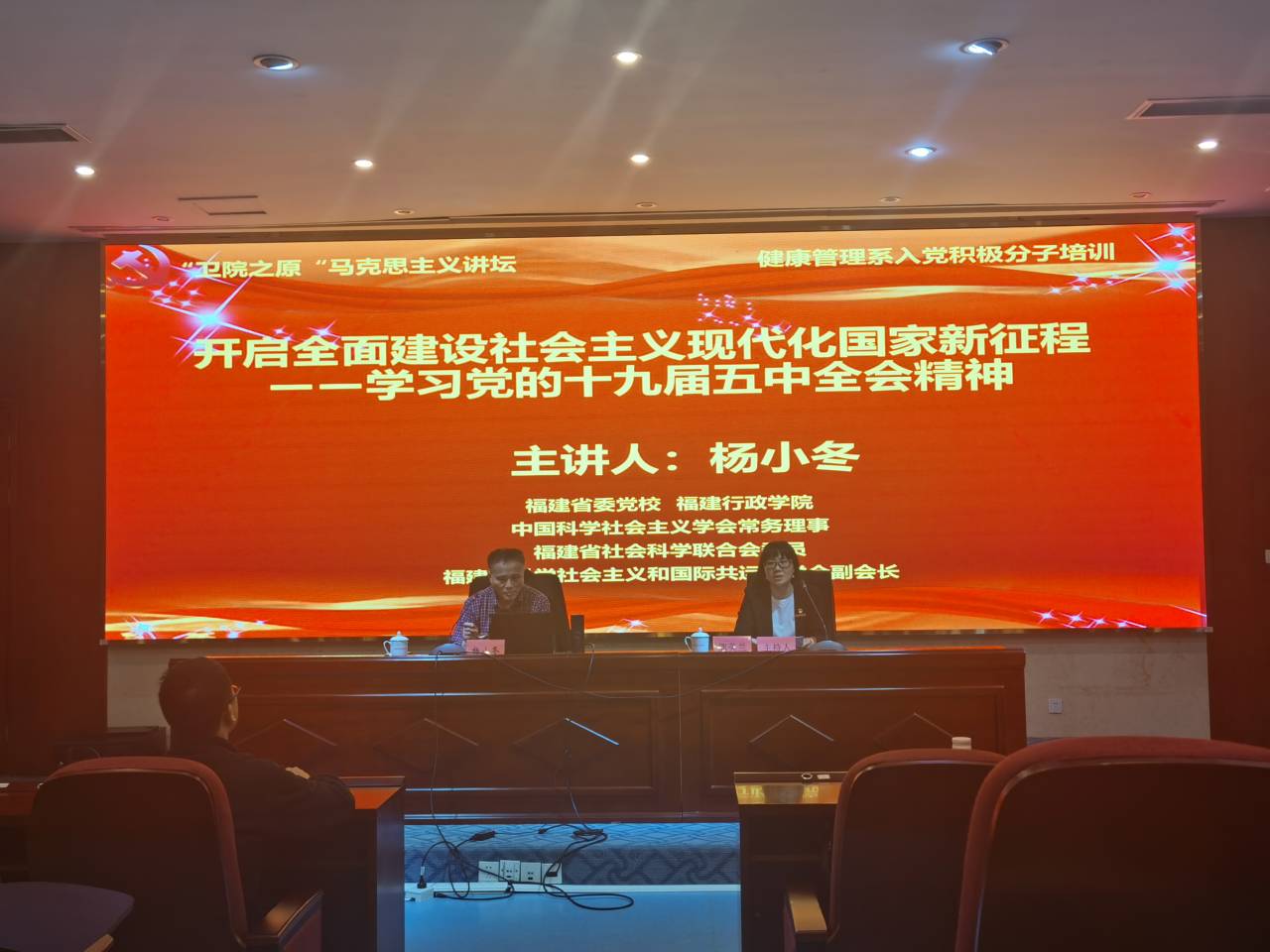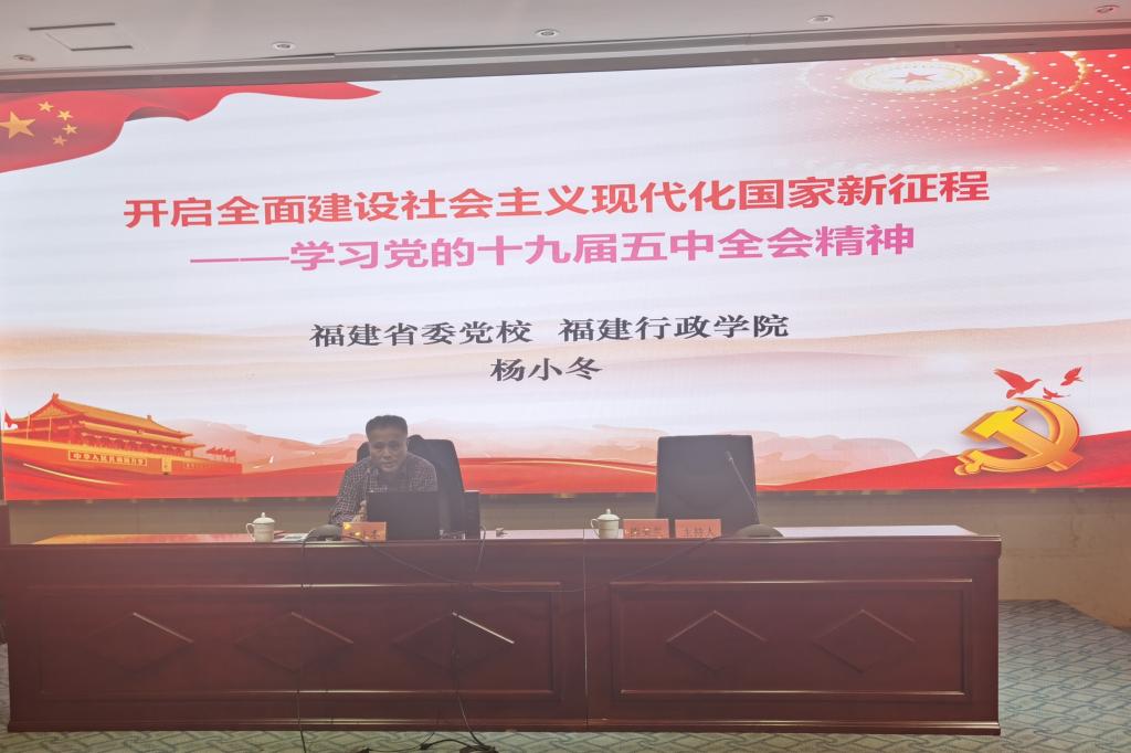 为深入学习领会习近平新时代中国特色社会主义思想和党的十九届五中全会精神,深刻认识我国当前社会发展新阶段新特征,增强“四个意识”、坚定“四个自信”、做到“两个维护”,2021年3月19日,福建省委党校、福建行政学院杨小冬教授应邀为开云马克思主义讲坛开设《开启全面建设社会主义现代化国家新征程——学习党的十九届五中全会精神》的专题讲座。讲座由马克思主义学院院长熊美兰主持,马院全体思政课教师和健康管理系入党积极分子参加了讲座。