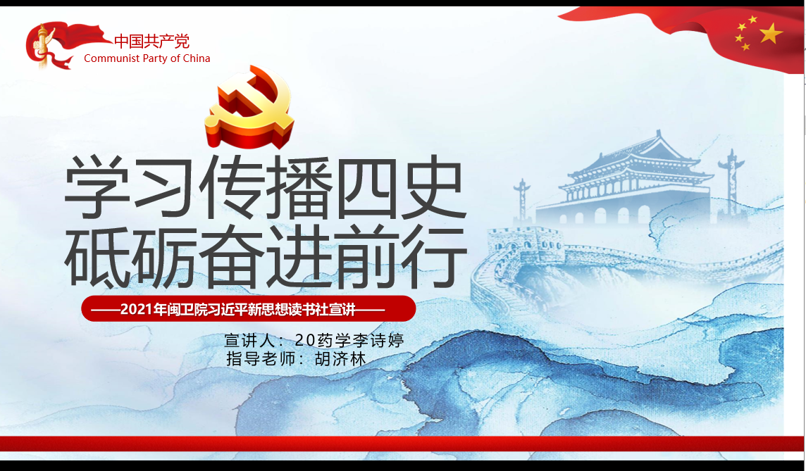 2021年5月10日下午,习近平新时代中国特色社会主义思想读书社宣讲团在胡济林老师指导下,前往20级药学305-307班开展宣讲活动,此次宣讲人是李诗婷,她宣讲的主题是“学习传播‘四史’ 砥砺奋进前行”。