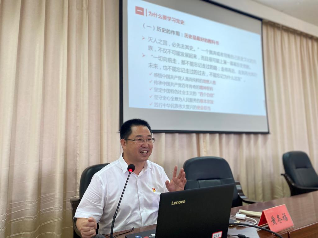 讲座中,黄冬福教授以其深厚的学术功底、饱满的热情、生动的语言围绕学习研究党史的目的意义、党史重要理论内涵、学习党史的方法论以及如何做好党史的忠实传人等四大方面,深入浅出地阐释了为什么要学习研究党史、怎样学习研究党史、如何做好新时代的党史传人。