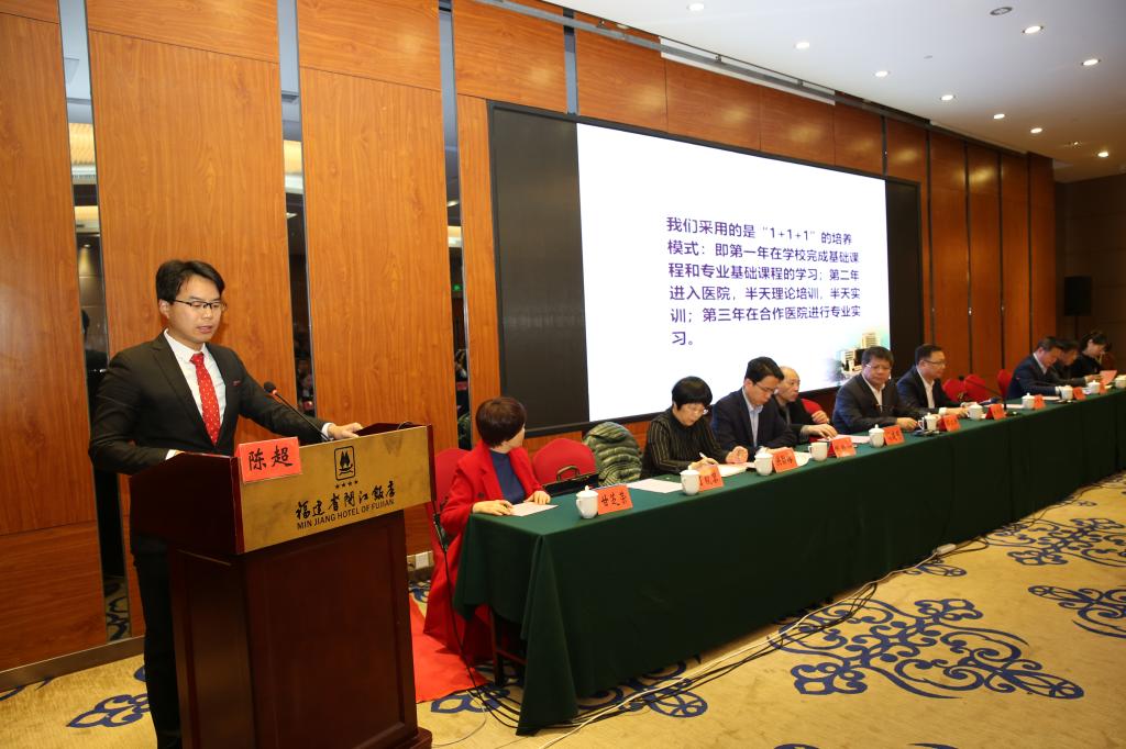 学校校企合作理事会单位代表福建省肿瘤医院科教科、校企合作班班主任陈超老师在大会上作了交流发言。