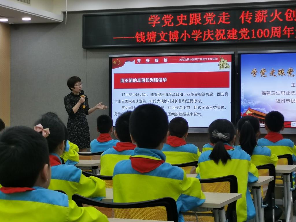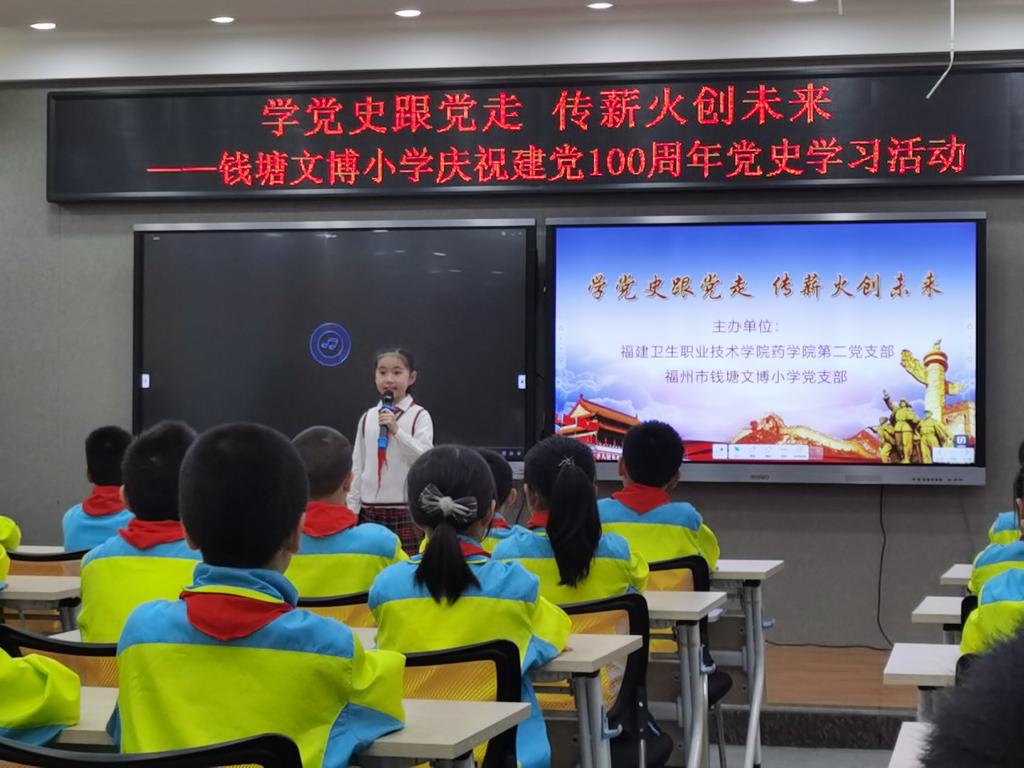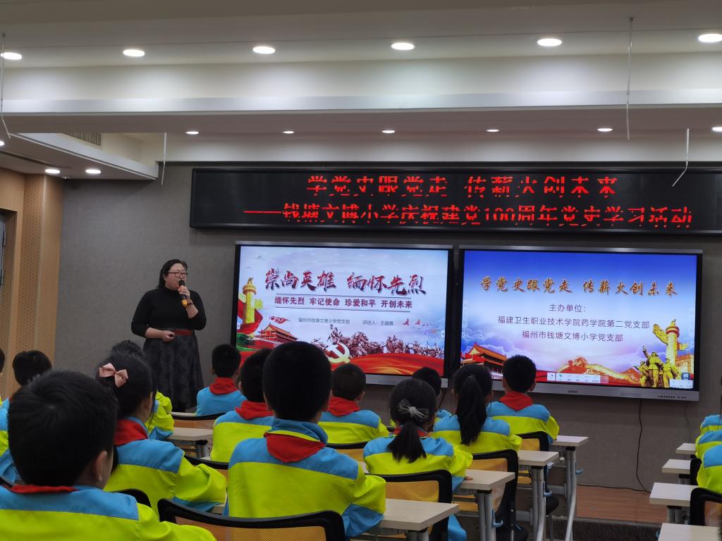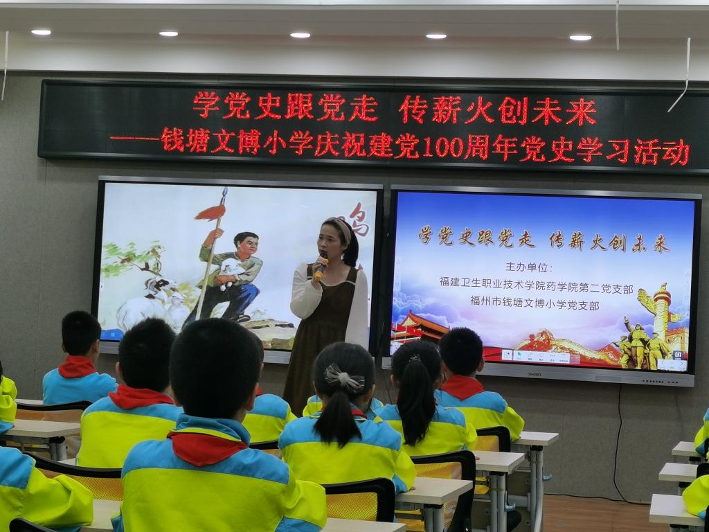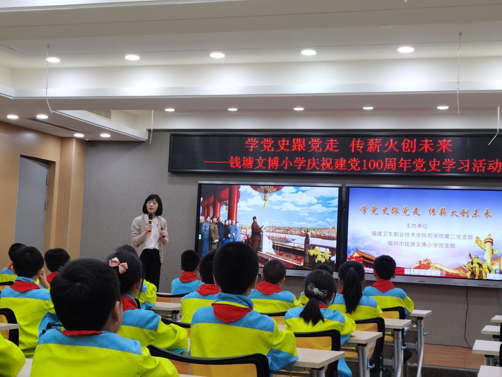 药学院第二党支部书记刘丹丹为钱塘文博小学的同学们介绍中国共产党成立的历史背景,总结了中国共产党人领导中国人民推翻“三座大山”彻底改变中国面貌的丰功伟绩,指出了中国共产党带领中国人民走出困境的历史必然性。刘书记激情澎湃的演讲点燃了同学们学习党史的热情。