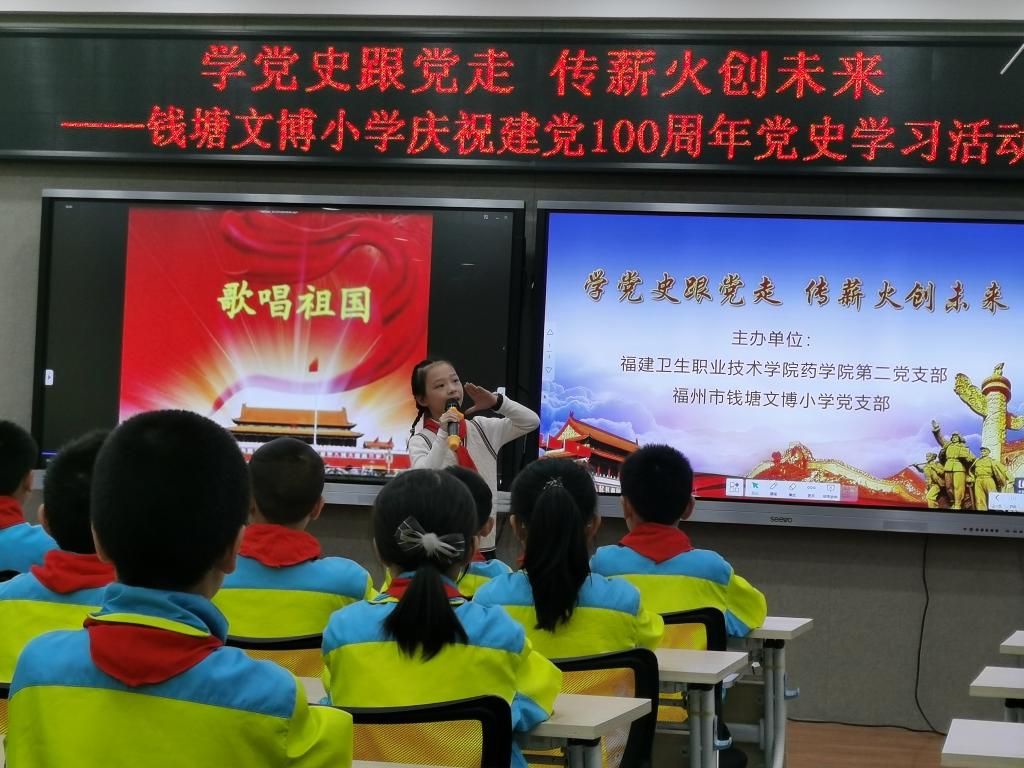 2021年4月16日下午,开云药学院第二党支部与福州市钱塘文博小学党支部联合开展了以“学党史跟党走,传薪火创未来”为主题的党史学习教育。其余未能到现场的师生,通过现场直播的方式同步线上参与活动。