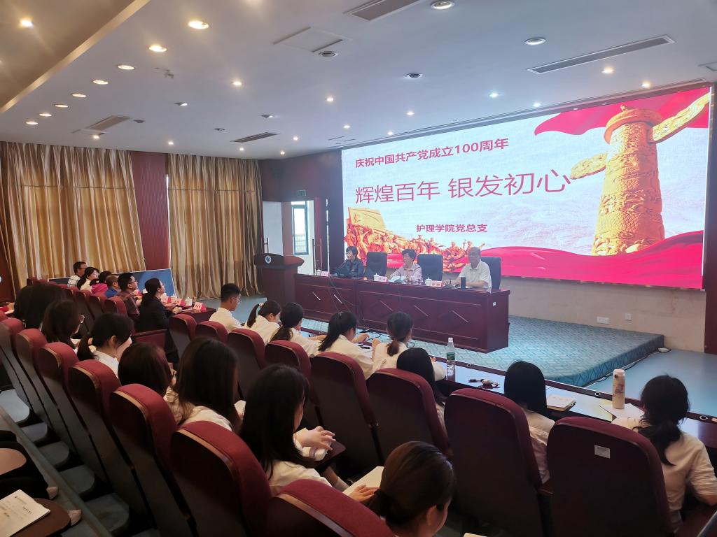 2021年5月6日,护理学院党总支在实训楼四楼报告厅举行“辉煌百年 银发初心”主题党日活动。本次活动邀请了关工委主任严肃、副主任陈雄来校授课。副校长黄铭珊、学生工作部部长宋维,组织统战部、人事处、护理学院党总支全体教职工党员及护理学院党总支入党积极分子共200余人参加了此次活动。