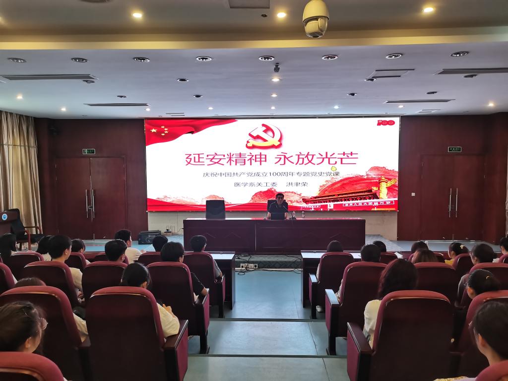为庆祝中国共产党成立100周年,2021年5月20日,医学系党总支邀请系关工委常务副主任洪聿荣为预备党员、入党积极分子等青年学子们讲授《延安精神永放光芒》专题党课。
