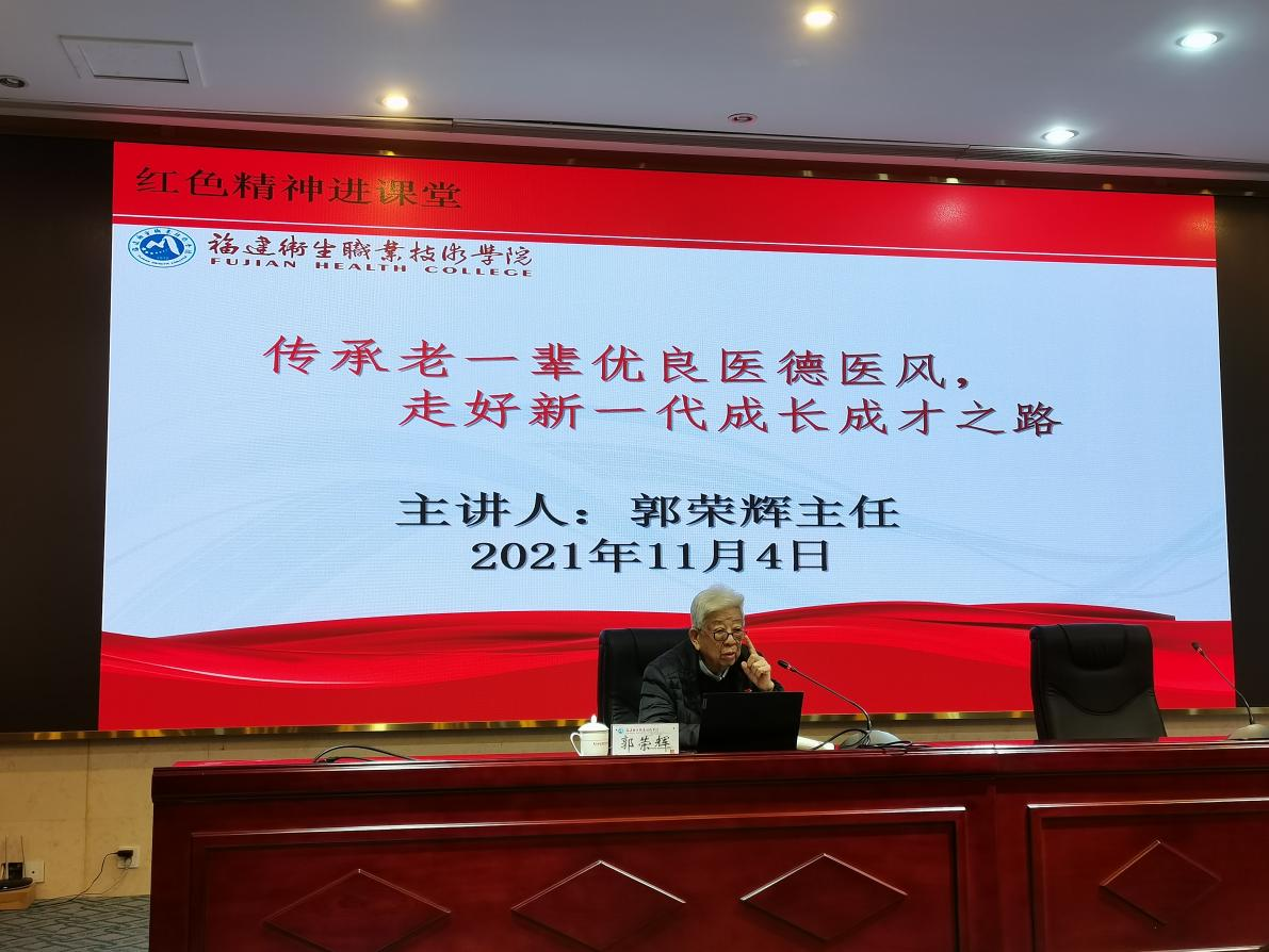 郭荣辉已年届86岁高龄,他用自己64年忠守践行党员使命的人生履历为师生带来了生动的讲座——《传承老一辈优良医德医风,走好新一代成长成才之路》。郭荣辉通过福建省附一医院易自翔教授的从医经历,向师生代表讲述了这名曾荣获国家科技进步奖二等奖的医务工作者如何磨砺崇高的医德和精湛的医术,寄语青年医学生应当成为一名让病人怀念的大医,成为一个有爱国情操、有感恩情怀、有仁爱之心的人。郭荣辉还分享了自己的学习、生活经验,嘱托青年学子在大学期间还要争当学生干部,夯实人生的实践基础,积累人生的技能经验。
