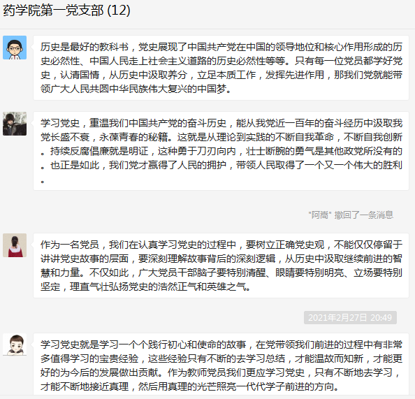 为深入贯彻习近平总书记在党史学习教育动员大会上的重要讲话精神,引导支部党员学史明理、学史增信、学史崇德、学史力行,2021年2月27日,药学院第一党支部在线上开展“学党史、守初心、强党性、担使命”主题党日活动,活动由支部书记何舒澜主持。