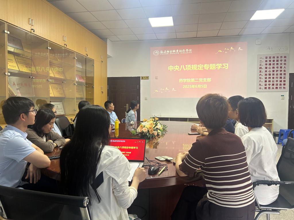 为推动党员深入贯彻中央八项规定精神学习教育,强化纪律意识与作风建设,6月5日,药学院第二党支部开展“理论研读+现场教学”双模式专题活动。本次活动由党支部书记刘丹丹主持,全体教师党员参加会议。