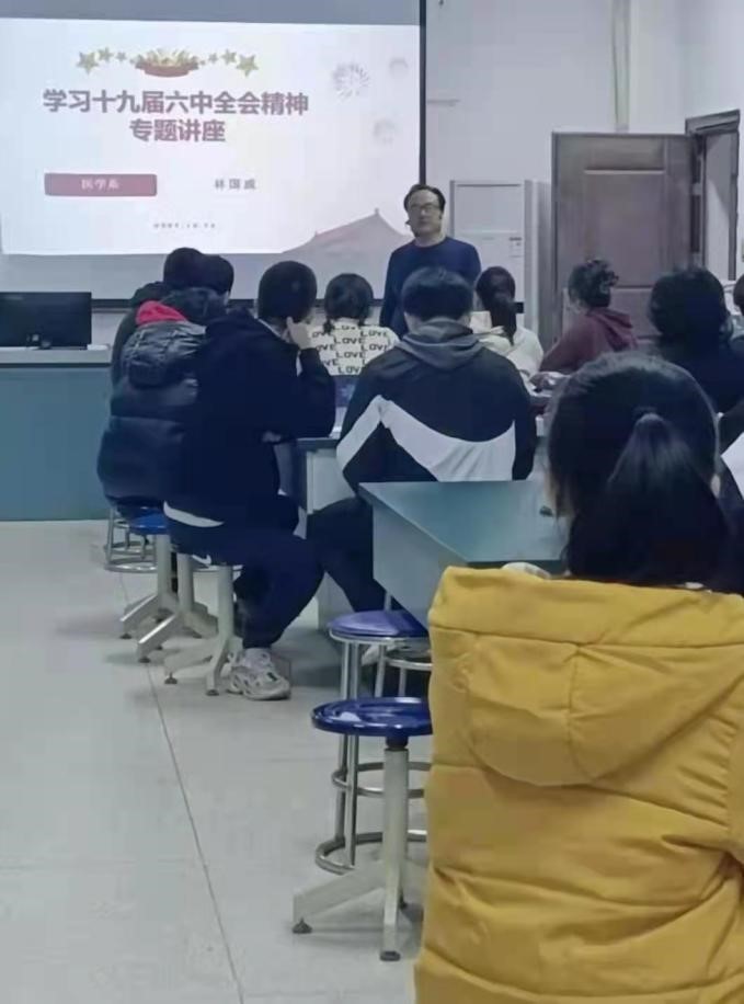 12月12日晚,医学系副主任林国威在医学基础部404为21口腔303班的学生宣讲党的十九届六中全会精神。
