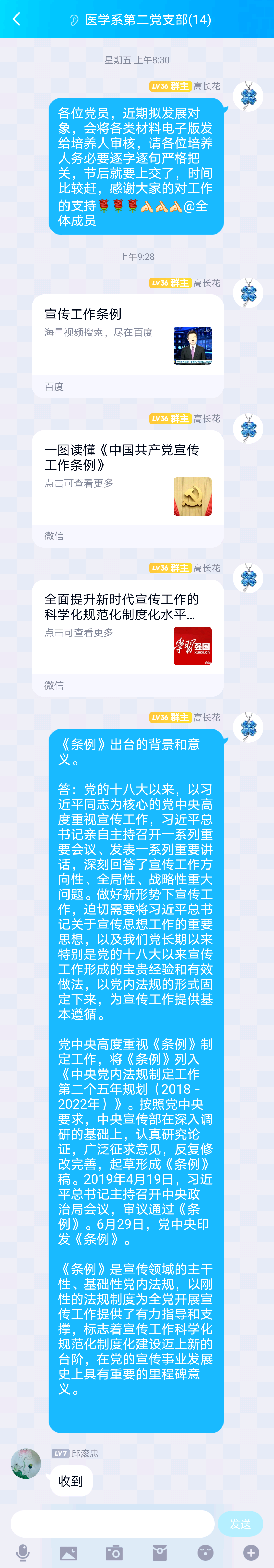 为提高全体党员的政治意识和宣传工作水平,2月8日上午,医学系第二党支部组织全体党员在线专题学习了《中国共产党宣传工作条例》(以下简称《条例》),学习活动由支部书记高长花同志主持。