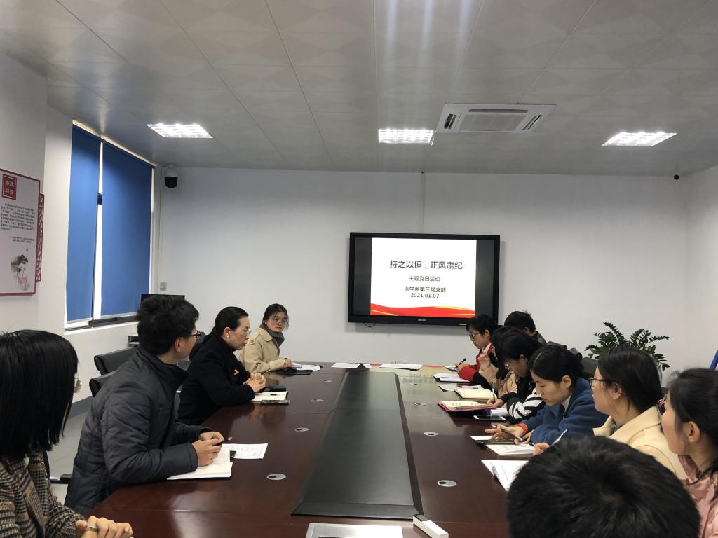 为进一步增强支部党员的纪律意识,提升党性修养,2021年1月7日中午,医学系第三党支部在实训楼311会议室开展“持之以恒,正风肃纪”主题党日活动。活动由支部书记陈铭同志主持。