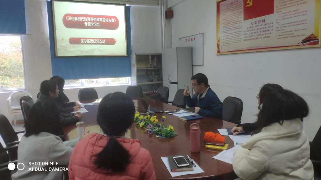 为深入学习贯彻中共中央、国务院印发的《深化新时代教育评价改革总体方案》的文件精神,12月31日下午,医学系第四党支部书记邓元荣同志组织支部全体党员进行专题学习讨论。