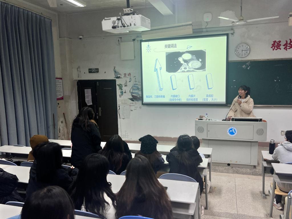 沈鸿君同学对如何高效听课进行了阐述,并分享了医学影像专业课的几种学习方法。还根据自己在实习中的经验提出,大学课程的学习不仅要注重理论知识的积累,还要关注实践操作能力的培养。她建议学弟学妹们在理论课堂上认真听讲,还要抓牢实训机会,多加练习。