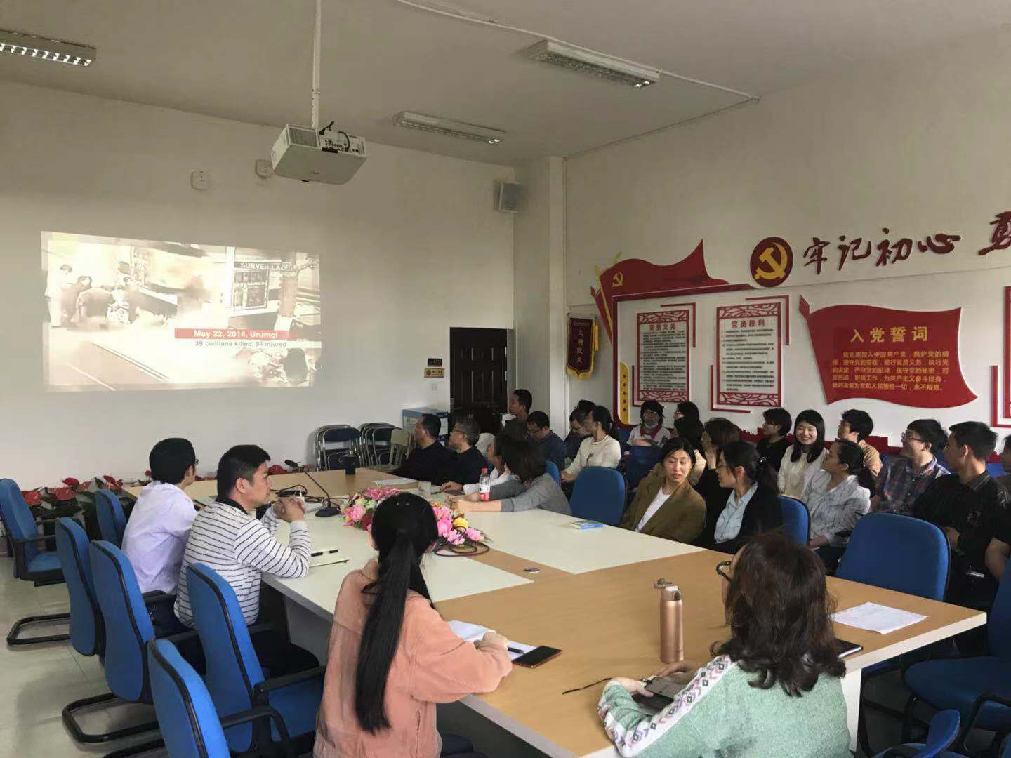 学习会上组织教师一起观看意识形态专题纪录片《暗流涌动——中国新疆反恐挑战》。