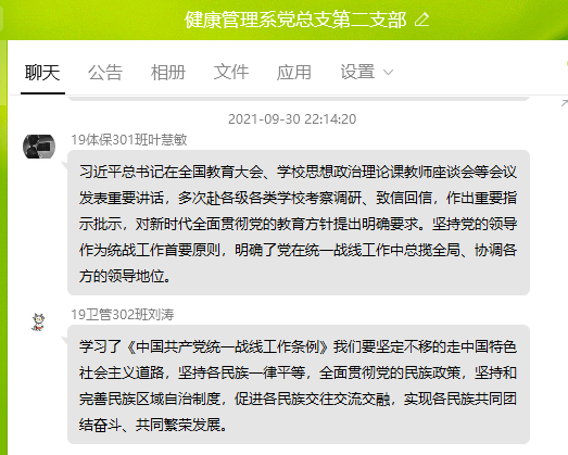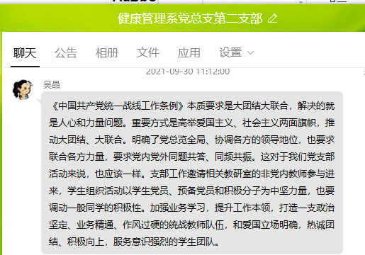 9月30日,健康管理系党总支第二支部组织全体师生党员开展专题学习交流会,学习《关于深入学习宣传贯彻党的教育方针的通知》精神、《中国共产党统一战线工作条例》及《中共福建省委关于贯彻<中国共产党统一战线工作条例>的实施意见》。会议由支部书记张凯捷主持。
