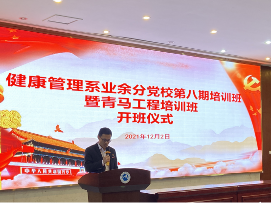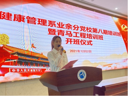 为进一步提高入党积极分子和青马工程培训班学员的政治理论水平,强化政治素养,把好发展党员入口关。2021年12月2日中午,健康管理系业余分党校第八期培训班暨青马工程培训班开班仪式在实训楼四楼会议厅成功举行。健康管理系党总支书记黄曦书记、党总支副书记吴燕玲书记、支部书记、辅导员以及本期128名培训学员共同参与了此次开班仪式。