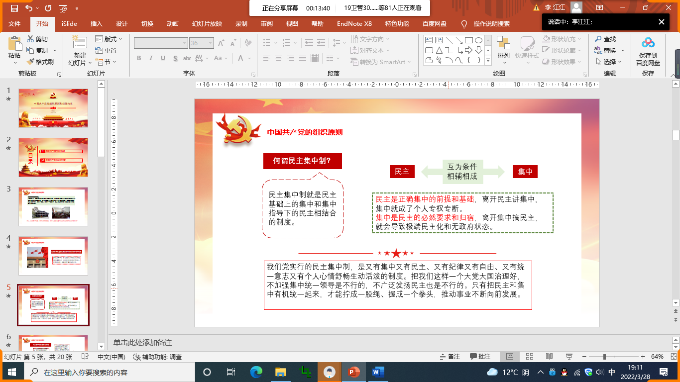 为了让同学们对中国共产党的组织原和纪律则有更清楚的认知,3月28日,在线上开展了主题为“中国共产党的组织原则和纪律”主题党课。本次由健康管理系辅导员李江江主讲,健康管理系业余分党校第八期培训班暨青马工程培训班全体学员参加此次党课。