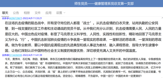 教师党员邱多多同志表示,在这场抗击疫情的阻击战中,所有坚守岗位的人都是“战士”。从抗击疫情的白衣天使、站岗执勤的公安民警,到一线支援的社区工作者和主动请战的党员干部。从中我们充分认识到,抗击疫情需要人民,人民的力量是巨大的。中国出色应对疫情,彰显了马克思主义科学性、人民性、实践性和创新性,精彩地回答了马克思主义为什么“行”。做为专业教师,我要以中国抗疫涌现出的先进典型和感人事迹为教材,融入课程思政,指导大学生读懂中国,让他们深刻认识中国特色社会主义制度的制度优势,深切感受充满人文关怀的中国温度。