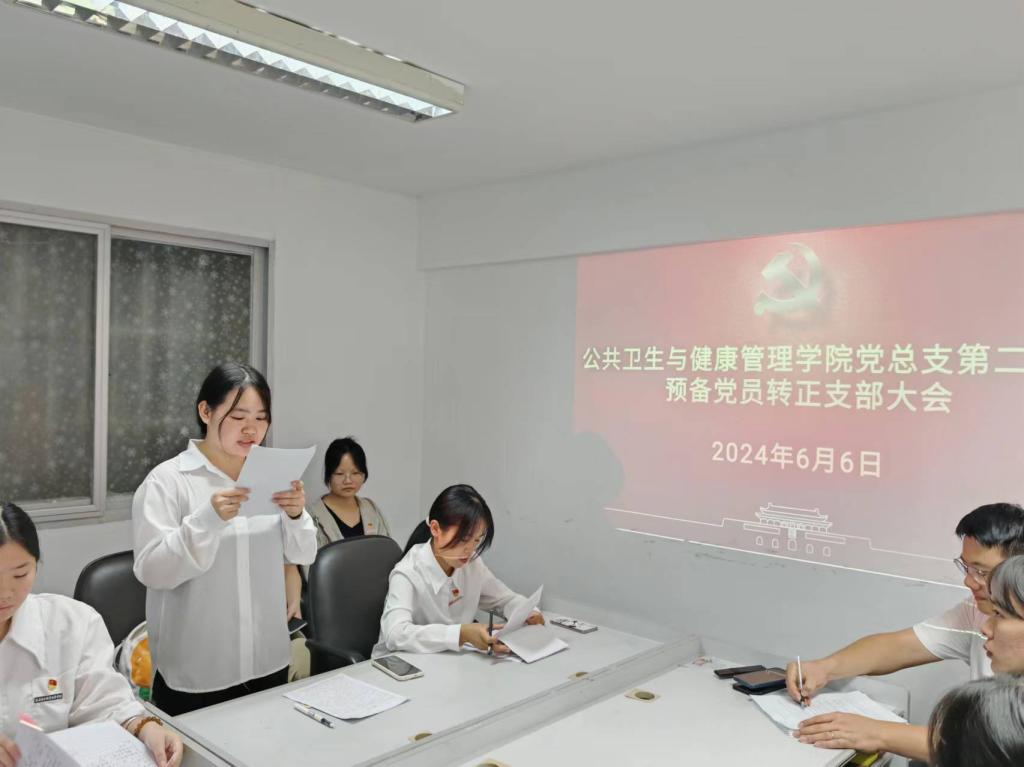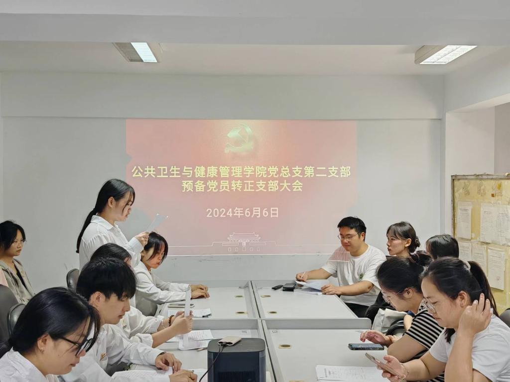 6月6日,公共卫生与健康管理学院党总支第二支部在学院会议室召开预备党员转正大会,会议主要讨论并审议了张艺铭等7名预备党员转为正式党员的申请。会议由党支部书记张凯捷同志主持,支部全体党员参加了此次大会。