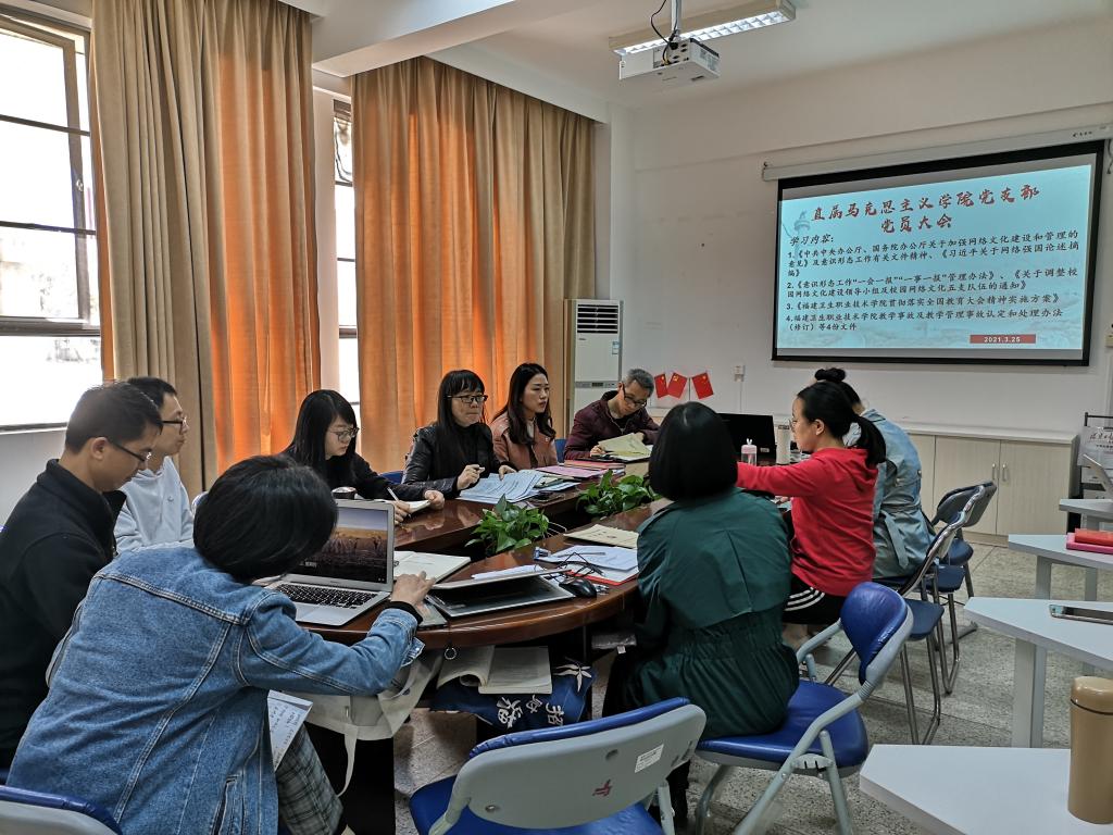 2021年3月25日上午,直属马克思主义学院党支部在行政楼107召开第一季度意识形态工作会,本次会议由直属马克思主义学院党支部书记熊美兰主持,支部全体党员参加了会议。