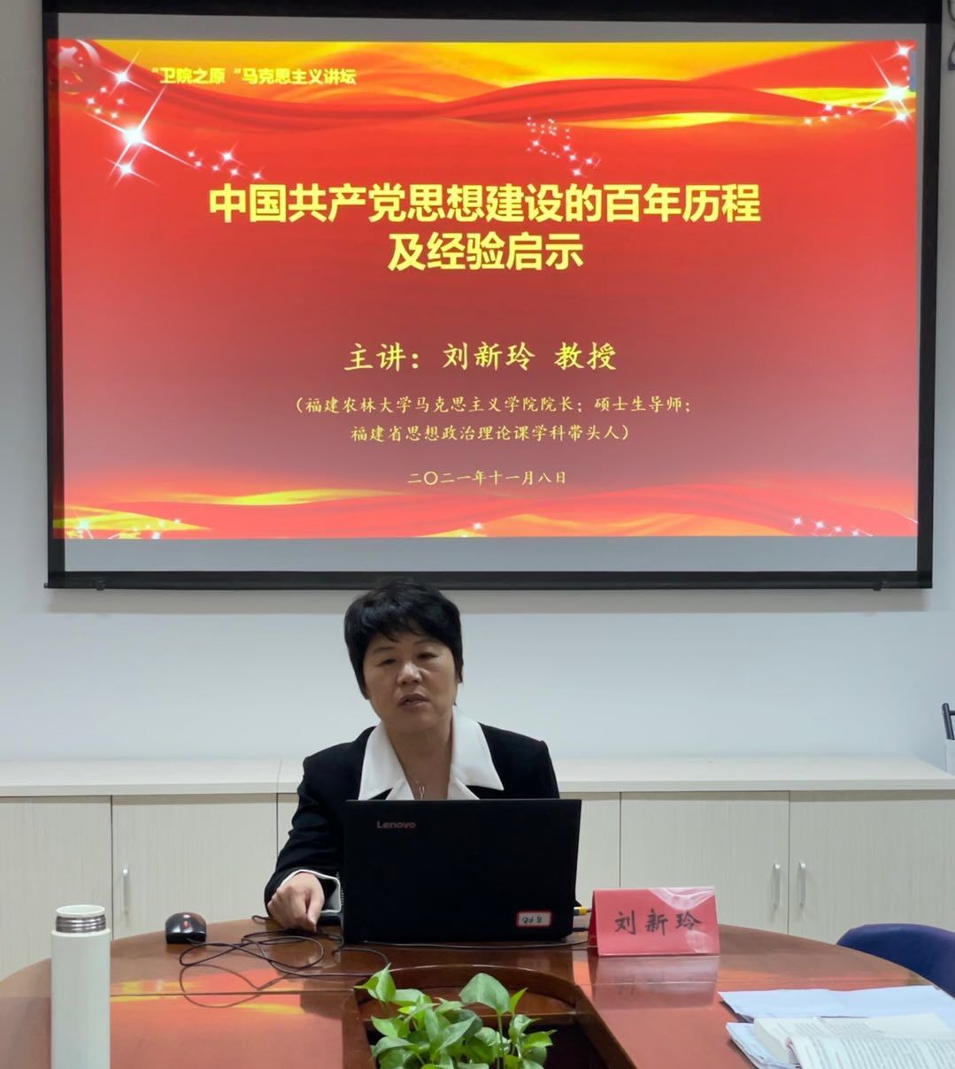 为贯彻落实“七一”重要讲话精神,深入学习百年党史,从党的百年奋斗历程中感悟思想伟力,2021年11月8日,开云马克思主义学院特邀福建农林大学马克思主义学院院长、福建省思想政治理论课学科带头人刘新玲教授在行政楼107会议室作题为《中国共产党思想建设的百年历程及历史经验》的专题讲座。讲座由马克思主义学院院长熊美兰主持,马克思主义学院全体专兼职教师出席。