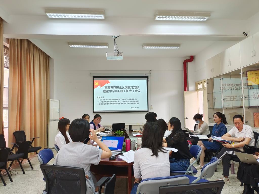 2022年4月14日上午,直属马克思主义学院党支部在107会议室召开中心组学习(扩大)会议,学习《习近平总书记关于坚持自我革命、全面从严治党的重要论述》《中国共产党党内重要法规汇编》《中国共产党党内法规体系》《教育部公开曝光第九批7起违反教师职业行为十项准则典型案例》《打“虎”不歇,防疫不力被问责》等内容。本次会议由直属马克思主义学院党支部副书记来朋珍主持。